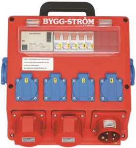 Uttagscentral med 6 st schuko-uttag varav 2 st är sidomonterade och gemensamt avsäkrade, 2 st ej avsäkrade CEE-uttag 16A. Samtliga uttag skyddas av jordfelsbrytare.
