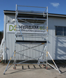 Bred plattform på 130 cm. Längd 250 cm. Max plattformshöjd 4 meter (ca 6 meter arbetshöjd). Totalhöjd på ställningen är ca 5,1 meter.Lutande stege på varje våningsplan ingår.Rejäla hjul som är justerbara för ojämnheter med ett enkelt handgrepp. Passar även utomhus.