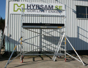 Lutande stege ingår.Rejäla hjul som även passar utomhus. Priset avser komplett ställning inkl. hjul, lutande stege,1 plattform och skyddräcke.