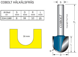 Hålkälsfräs av högsta kvalitet från Cobolt. Skärbredd 16mm, skärdjup 25mm.