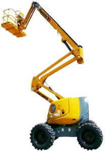 Haulotte HA 18 PX ledbomslift. Kan köras från korgen i uppfällt läge. Inga stödben behöver fällas ut. Dieseldriven bomlift med drivning på alla fyra hjulen.