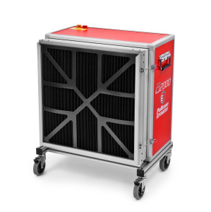 Flöde, 2000m3/tim. Kan köras i två hastigheter. H13-filtret som klarar asbest kraven och är försett med petskydd. Utrustad med dubbla varningslampor med signal. Röd lampa för läckage – trasigt filter, orange lampa för igensatt filter 90%. Luftutblåset är riktat 90º från inloppet och försedd med utloppsstos på Ø160mm, för anslutning av evakueringsslang (max 8m). Hjulen är av ”non marking-type”, punkteringsfria samt låsbara. Luftrenaren är som standard utrustad med timräknare och extra eluttag.