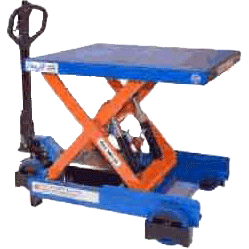 Praktiskt batteridrivet lyftbord med manuellt draget hjulunderrede liknande en pallyftvagn.