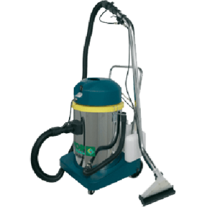 40 grader varmt vatten och rengöringsvätska sprutas ner av pump och sugs upp genom vaccum av ett sugmunstycke till en separat inbyggd smutsvattentank.