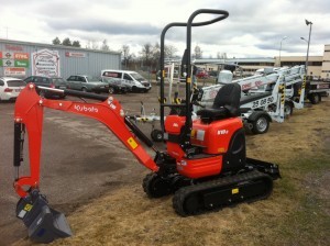 runtomsvängande minigrävare på 1 ton. Med vikbar störtbåge men utan hytt som minskar vikt och möjliggör transport på släp som klarar 1100 kg och dessutom med vanligt körkort.