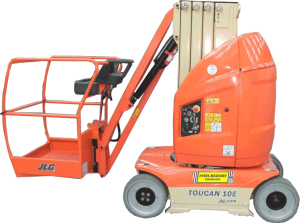 JLG Toucan10E. Runtomsvängane och självgående pelarlift med jibb som klarar räckvidd -3,4 meter. Liften kan köras på full höjd, styras och höjdregleras från manöverboxen på plattformen. Idealisk för ex.vis industr, varuhus, kontor och lager och kräver små utrymmen.
