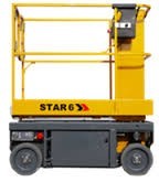 Star 6 är den mest använda storleken på saxliftar, allmänt kallad smalsax. Detta är en typisk inomhusgående lift, men kan även användas utomhus med underlag som betong eller asfalt. Kan på full höjd köras, styras och höjdregleras från manöverbox på plattformen.