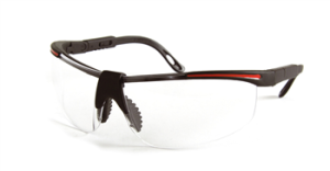 Skyddsglasögon med svart båge. Mjuk svart dämpning vid näsa. Skalmen är justerbar i längd och går att vinkla. Lins av polykarbonat. Rep- och imfri.