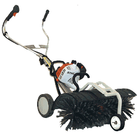 Motordriven sopmaskin med hjul och gummivals för skräp, löv, snö, grus etc. Jämna ytor . Ej sten