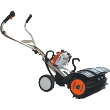 Motordriven sopmaskin med hjul och gummivals för skräp, löv, snö, grus etc. på jämna ytor.