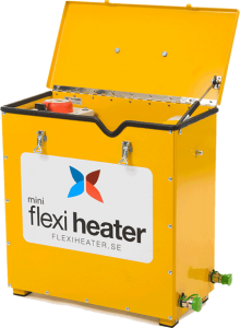 "Flexi Heater" Tjältiningsmaskin, en unik världsnyhet där maskinen kopplas ihop med vätskfylld slangvinda. Slangen läggs ut på marken med ca 20 cm mellanrum och täcks sedan över med speciella isolermattor. För att behålla värmen ytterligare kan övertäckning kompletteras med presseningar. Bäst effekt erhålles med 380V och klarar då 150 meter slang och ca 25m2 med 30 cm djup per dygn.