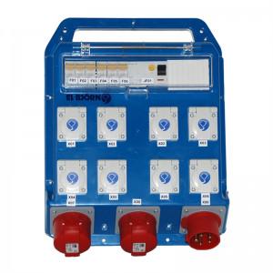 Mindre bärbar central med många 1-fas uttag, lämplig vid arbete på mindre byggen, rotjobb m.m. Alla uttag skyddade av jordfelsbrytare på 30mA.